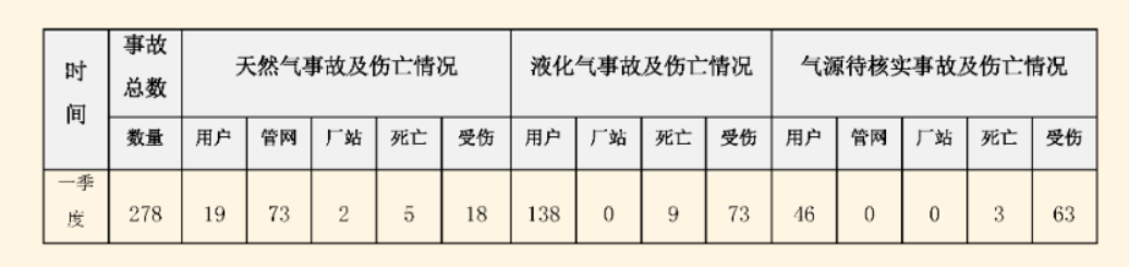 中国城市燃气协会安全管理工作委员会发布的《全国燃气事故分析报告·2022年第一季度》(下称《报告》)指出,今年一季度发生燃气事故278起,比上季度环比增加4.1%。