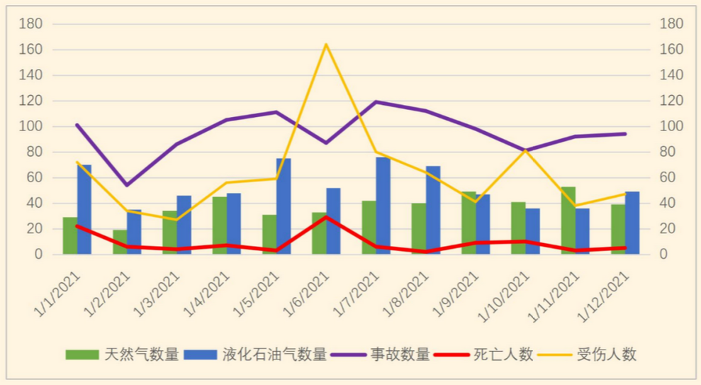 2021年,中国城市燃气协会安全管理工作委员会共收集到媒体报道的国内燃气事故1140起,同比增加70.7%。事故共造成106人死亡,763人受伤,重大事故1起、较大事故8起。