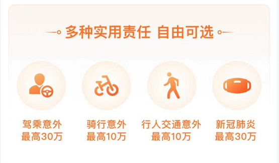 此外,当前喜欢自驾露营、骑行的人越来越多,随着疫情蔓延选择骑行自驾上班的人也越来越多,人们对这些场景的保障需求在增加。水滴巡洋舰意外险,提供4大可选实用责任——骑行(含自行车、电瓶车)意外最高10万元;自驾非营运车意外最高30万元,行人交通意外最高10万元;新冠肺炎身故最高30万元。