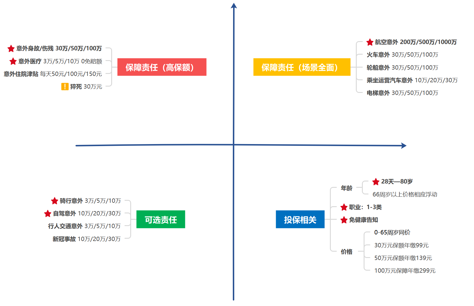 这款产品在多种意外场景都设置了高额保障。其中,航空意外最高保额为1000万元,火车、轮船、电梯意外最高保额为100万元,乘坐营运汽车意外最高可达30万元。
