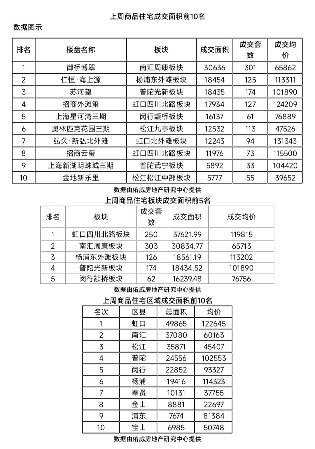 上周商品住宅成交面积前10名榜单中,成交均价最高的是位于虹口北外滩板块的项目弘久·新弘北外滩,成交均价最低的是松江区松江中部板块的金地新乐里,成交均价分别为131343元/平方米和39652元/平方米,相差9万以上。上周商品住宅板块成交面积前5名分别位于虹口区、浦东新区、杨浦区、普陀区、闵行区,共成交套数915套,门槛是62套。