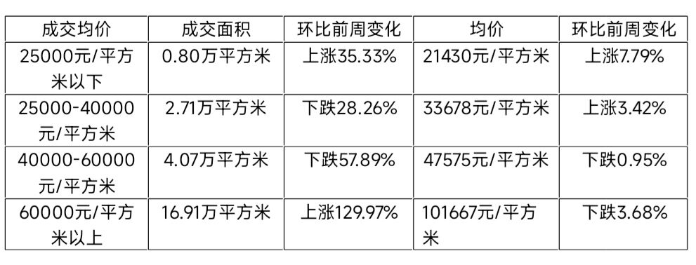 上周上海市商品住宅成交面积为24.49万平方米,环比前周上涨14.50%;上周全市商品住宅成交均价为82534元/平方米,环比前周上涨28.36%。