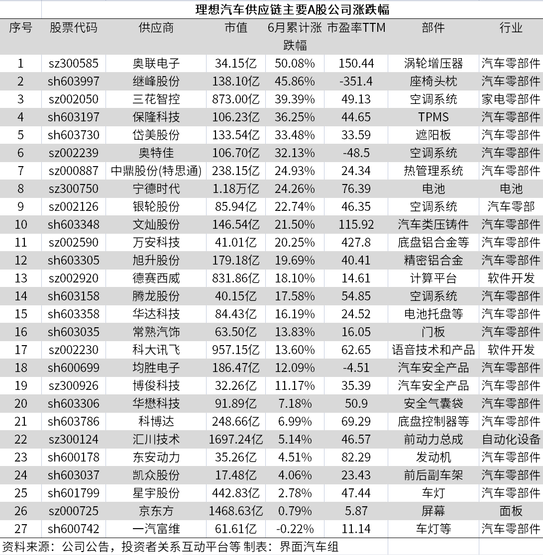界面新闻整理统计发现,理想汽车供应链主要A股公司中,6月累计涨幅超20%有11家公司,市盈率TTM介于10至30之间有5家公司,其中奥联电子涨幅超50%,继峰股份涨幅达45.86%。