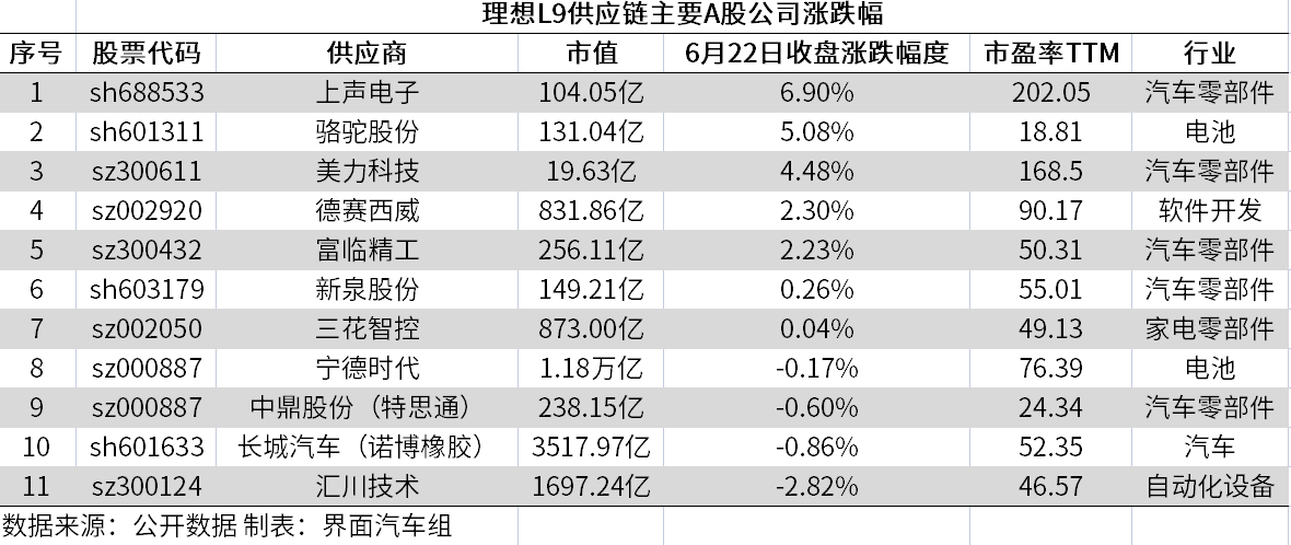 6月21日晚理想汽车发布L9,售价45.98万元,比四年前第一款车理想ONE贵了11万元。据界面新闻整理数据,22日L9供应链主要A股公司平均收涨1.53%,上声电子、骆驼股份、美力科技涨幅4%以上,上证指数收跌1.20%,除汇川技术,其余相关公司均跑赢大盘。