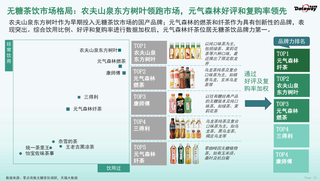 《报告》显示,农夫山泉东方树叶作为最早的入局者之一依旧领跑行业;新锐国货品牌元气森林势头也同样强劲,旗下燃茶、纤茶双双入围无糖茶饮品牌市场份额TOP5,其中,在品牌力表现排名上,纤茶位居行业第一,有望带领无糖植物茶饮这一细分领域走上发展快车道。