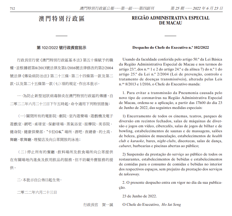 据澳门特区政府网消息,《澳门特别行政区公报》刊登第102/2022号澳门特区行政长官批示,23日17:00起,关闭所有的电影院、剧院、室内游乐场、游戏机及电子游戏室、网吧、桌球室、保龄球场、蒸气浴室、按摩院、美容院、健身院、健康俱乐部、“卡拉OK”场所、酒吧、夜总会、的士高、舞厅、歌舞厅、理发店及向公众开放的泳池。