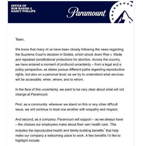 派拉蒙的首席执行官Bob Bakish和首席人事官Nancy Phillips也在向员工发送的邮件中强调,公司赞助的健康保险将为其员工提供前往合法地区进行节育、堕胎、流产护理等生殖健康护理的旅行费用。