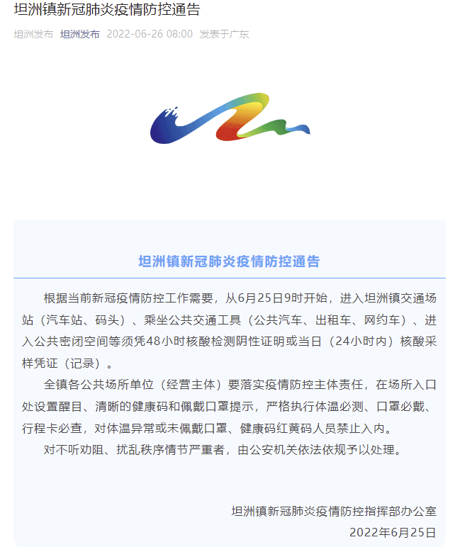 “坦洲发布”微信公众号26日消息,坦洲镇新冠肺炎疫情防控指挥部办公室通告,根据当前新冠疫情防控工作需要,从6月25日9时开始,进入坦洲镇交通场站(汽车站、码头)、乘坐公共交通工具(公共汽车、出租车、网约车)、进入公共密闭空间等须凭48小时核酸检测阴性证明或当日(24小时内)核酸采样凭证(记录)。