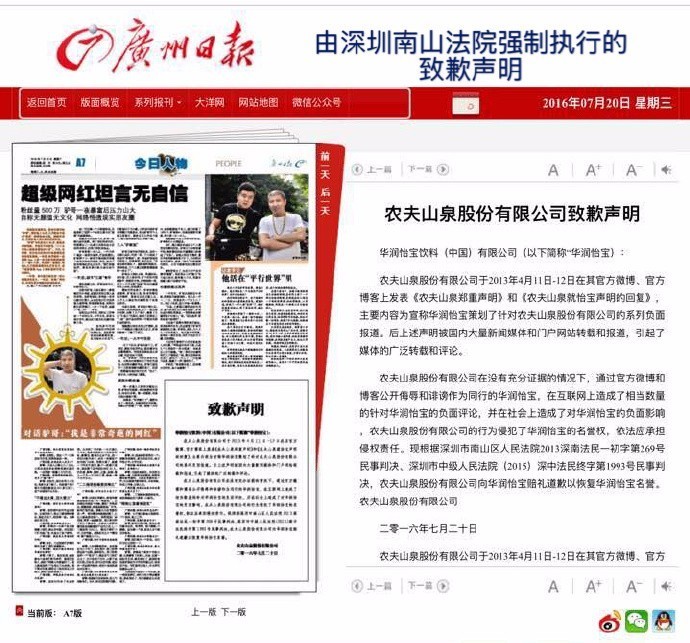 2016年,7月20日上午,农夫山泉公开在报上致歉华润怡宝,并承认曾侵犯怡宝名誉权。