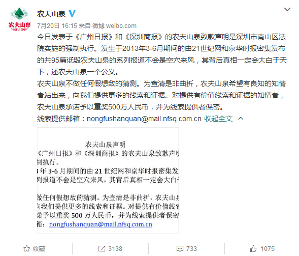 但是上午刚发布致歉信,下午人家可就发微博澄清了:道歉信是法院强制执行的,并非自愿。另外,农夫山泉愿意为提供有价值线索的知情者悬赏500万,以还农夫山泉一个公道。