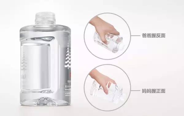 农夫山泉提出婴儿水的概念,瓶身设计十分人性化,瓶子整体呈桶装,比较像婴儿的奶瓶,瓶身的凹槽大小恰到好处,正面适合妈妈握,背面则更方便爸爸握。