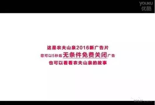 农夫山泉的情怀和人性化不仅体现在宣传片中,去年,农夫山泉还在视频平台上为自身的广告设置了“5秒可跳过”功能——5秒后你可以自己选择关闭广告。这一小小的改变,使宣传片曝光率得到了更大的提高。