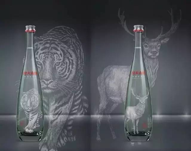 玻璃瓶高端矿泉水的包装设计历时三年,邀请了3个国家5家设计事务所进行创作,经历了50余稿、300多个设计。瓶身图案选择了长白山特有的物种,如东北虎、红松等,非常有人文关怀的气息。
