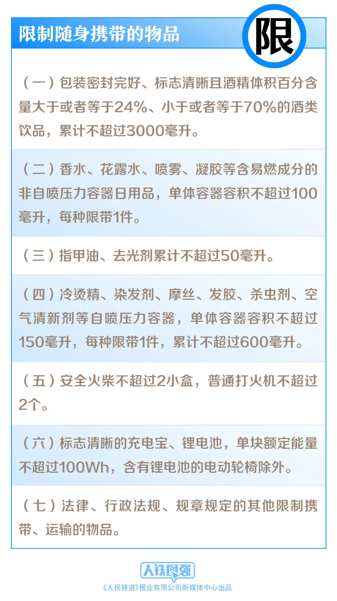 关于日常出门常需准备的充电宝、锂电池等物品,该目录也详细规定了携带要求,其中标志清晰、单块额定能量不超过100Wh的充电宝、锂电池才允许携带。
