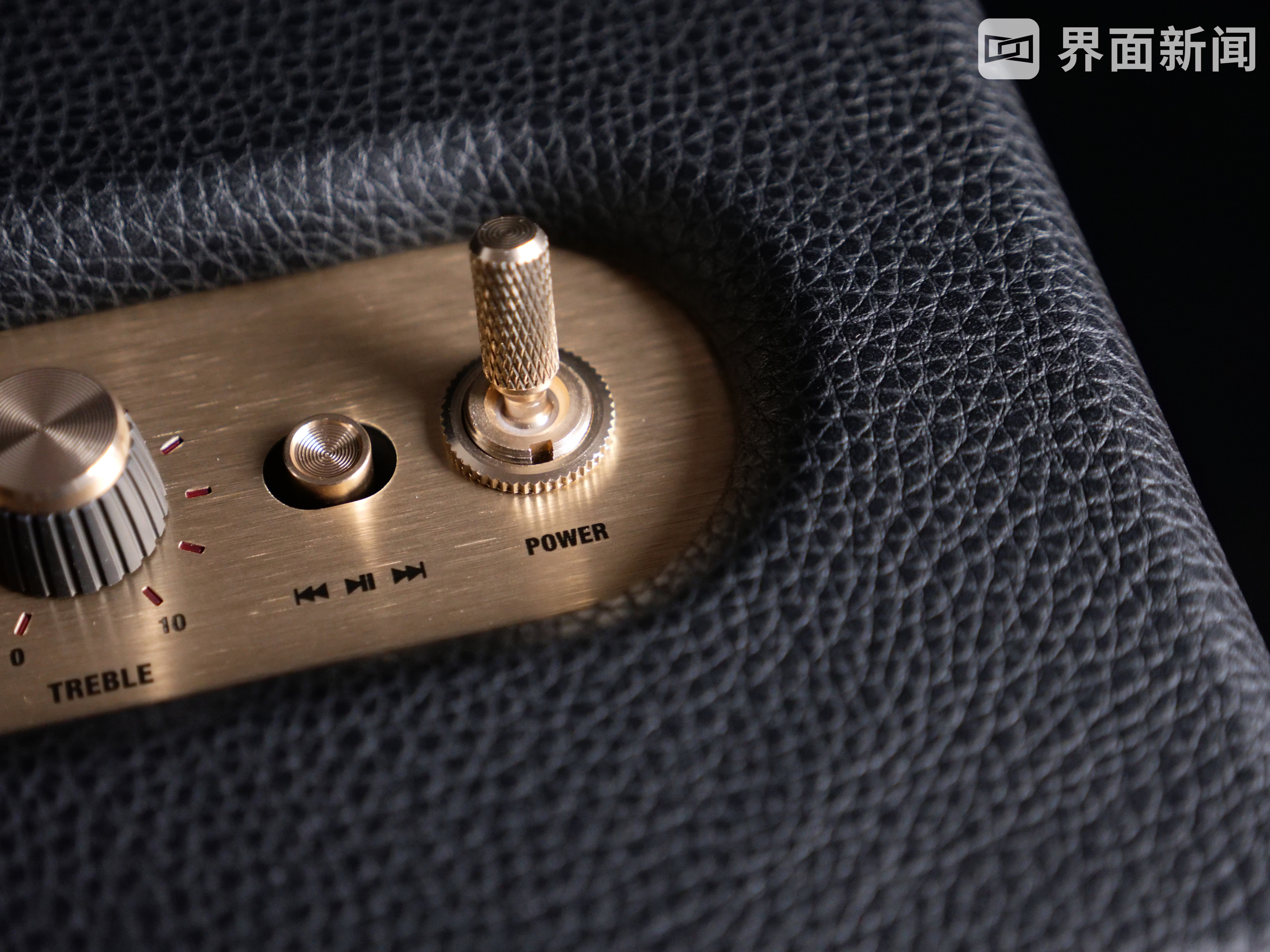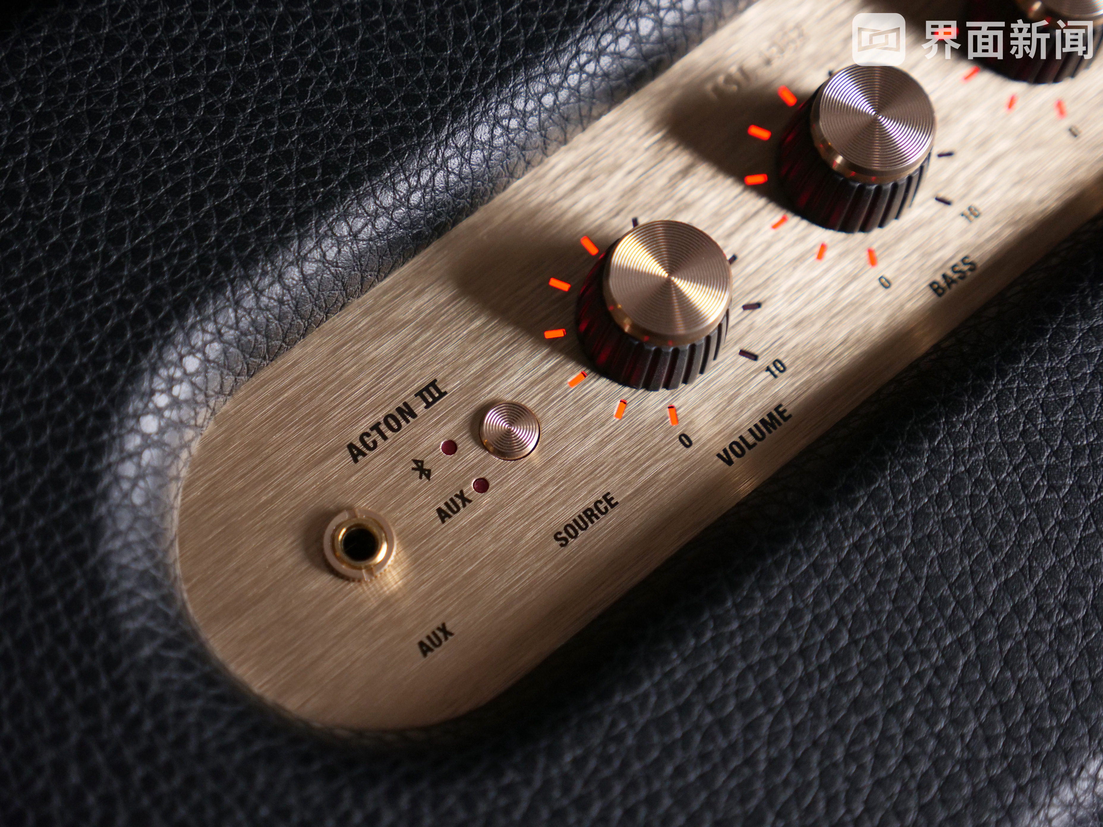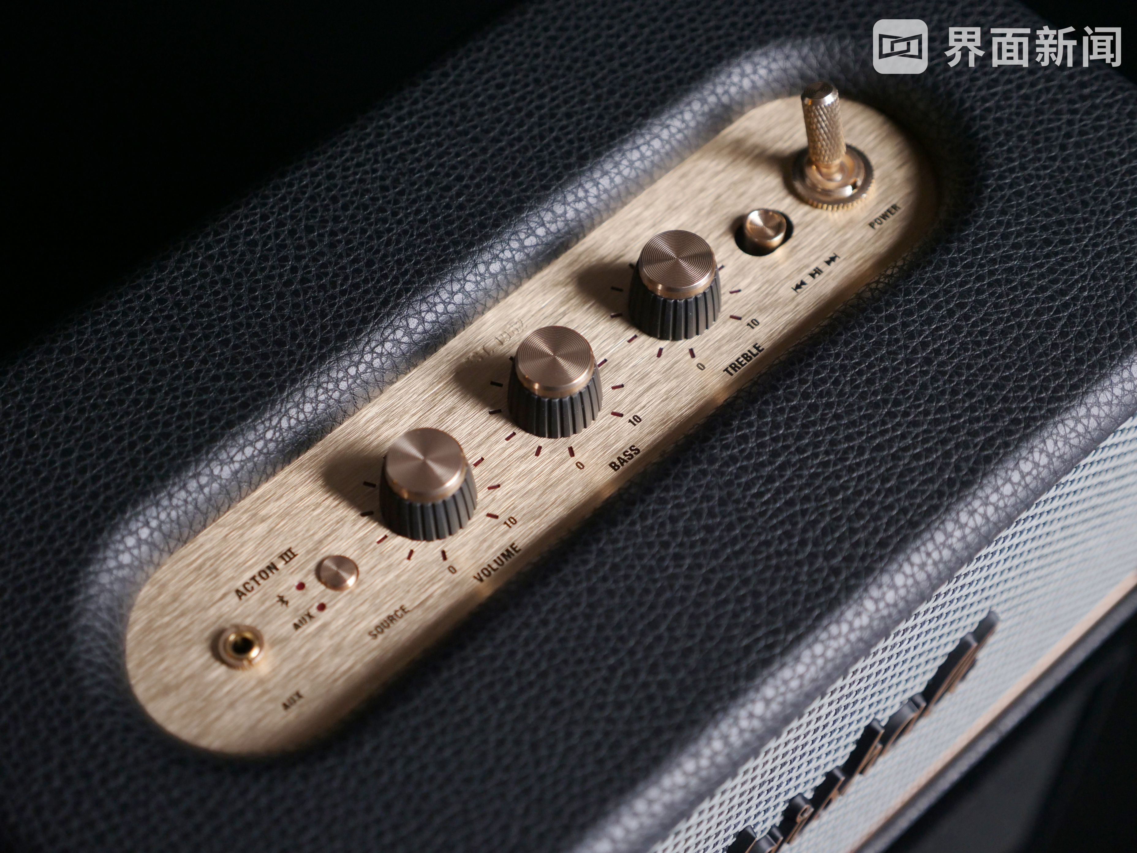 黄铜色的颜色搭配自然也不会缺席。在音箱的顶部,依次排列了各种实体按键,分别为3.5mm输入口、音源切换、音量控制、高低音控制按钮等等开关。整块区域金属的质感下,经过了一层拉丝的工艺处理,这种黑金的搭配,毫无疑问是一种比较经典内敛的设计组合。