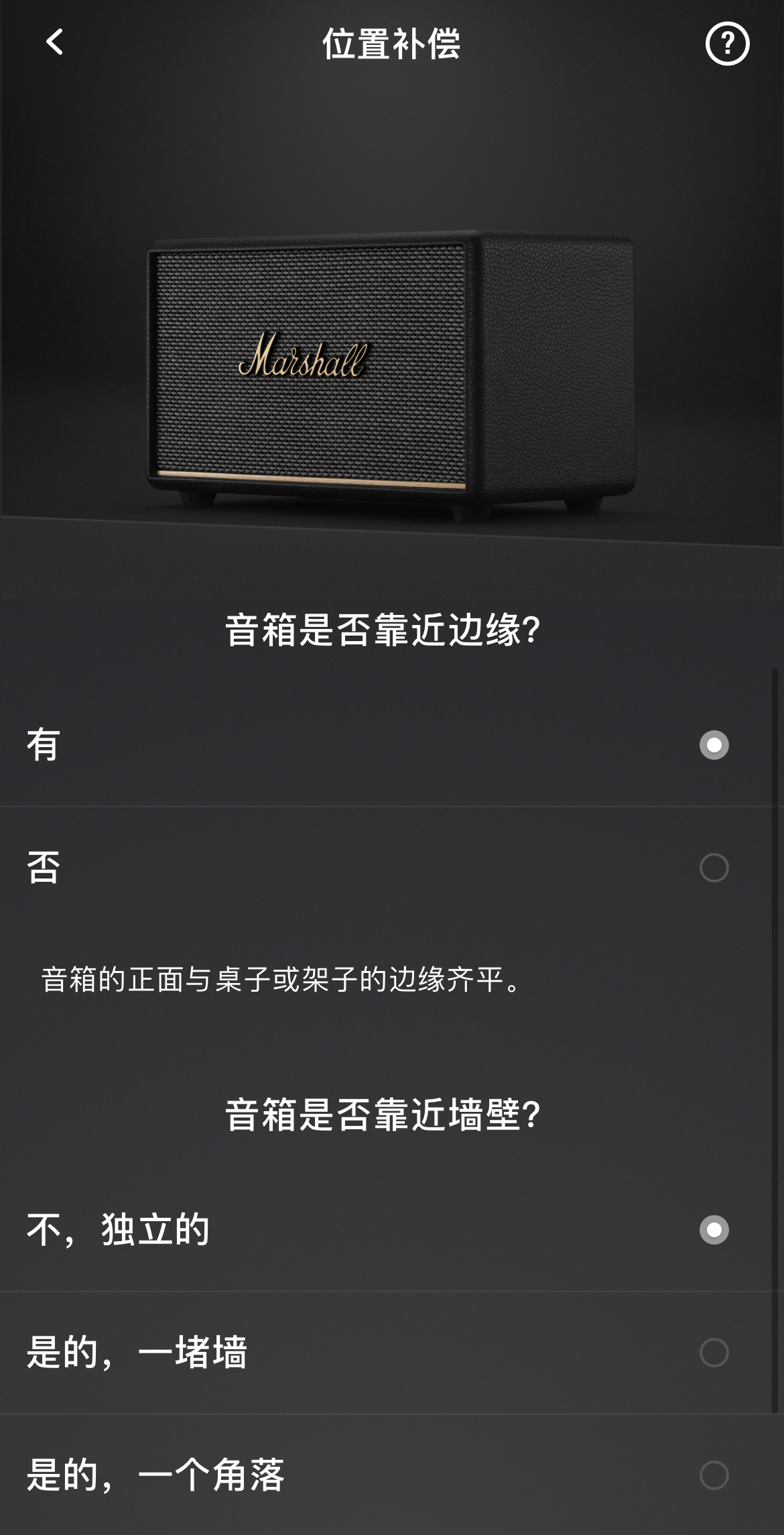 一个值得留意的细节是,在连接Marshall Bluetooth App以后,Acton III提供了“位置补偿”选项,通过摆放位置,来更加细致地调节音质效果。此外在App内也可以调节均衡器效果,这与音箱搭载的实体高低音旋钮,功能是一致的。