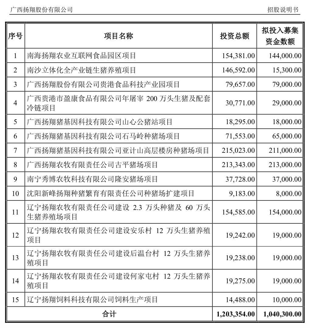 另一家扬翔股份预计募资约104.03亿元。 公司主营业务为生猪养殖和饲料生产。公司主要产品包括养殖产品和饲料产品,其中养殖产品包括种猪、育肥猪、商品仔猪和猪精,饲料产品包括猪只全生命周期阶段所需要的饲料。