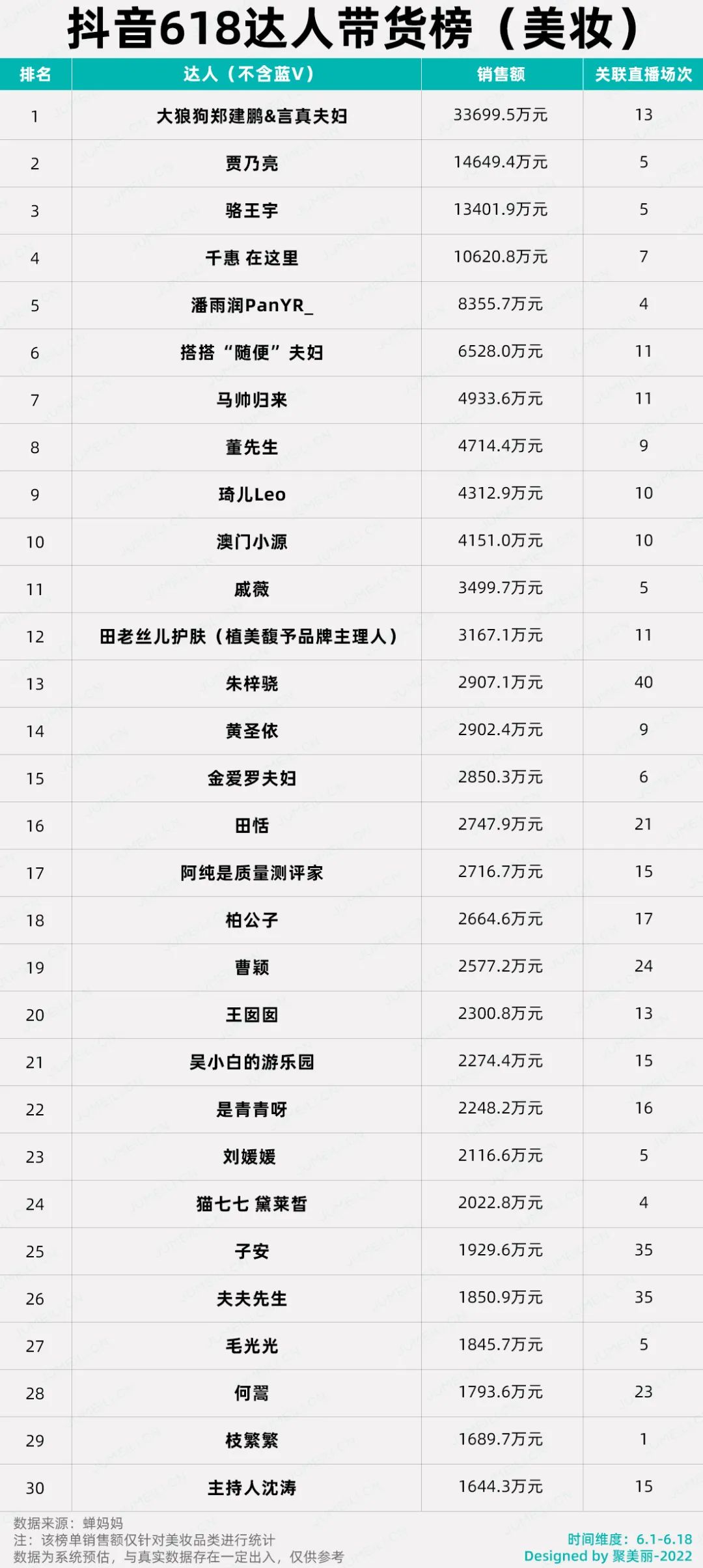 而在美妆达人带货榜中(该榜单仅统计主播活动期间美妆类目销售额,下文除特殊说明外,所指销售额也仅针对美妆类目),则有广东夫妇、贾乃亮、骆王宇、千惠在这里等4个主播的销售额破亿,近10个主播(包括上述4个主播)的销售额超4000w。戚薇、朱梓骁、黄圣依等明星主播的销售额也基本都在3000w左右。