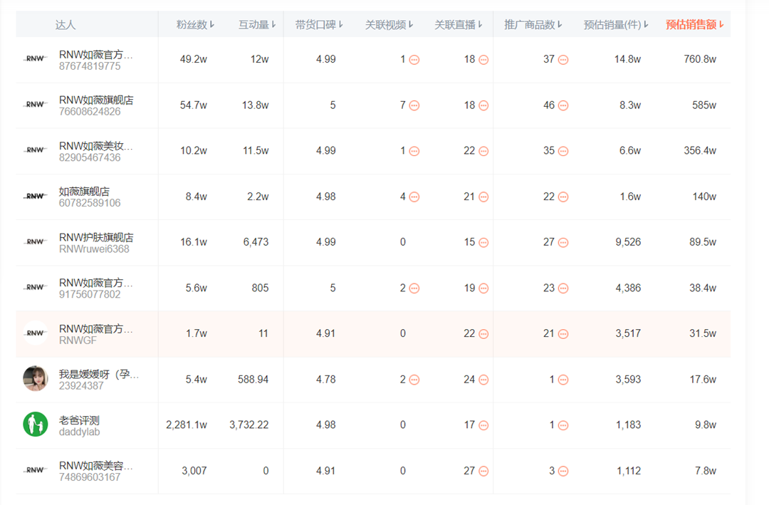 而618期间RNW如薇销售额前10的达人中,有8个都是品牌账号,其中有4个账号的销售额皆超百万,RNW如薇官方的销售额则超760.8w。