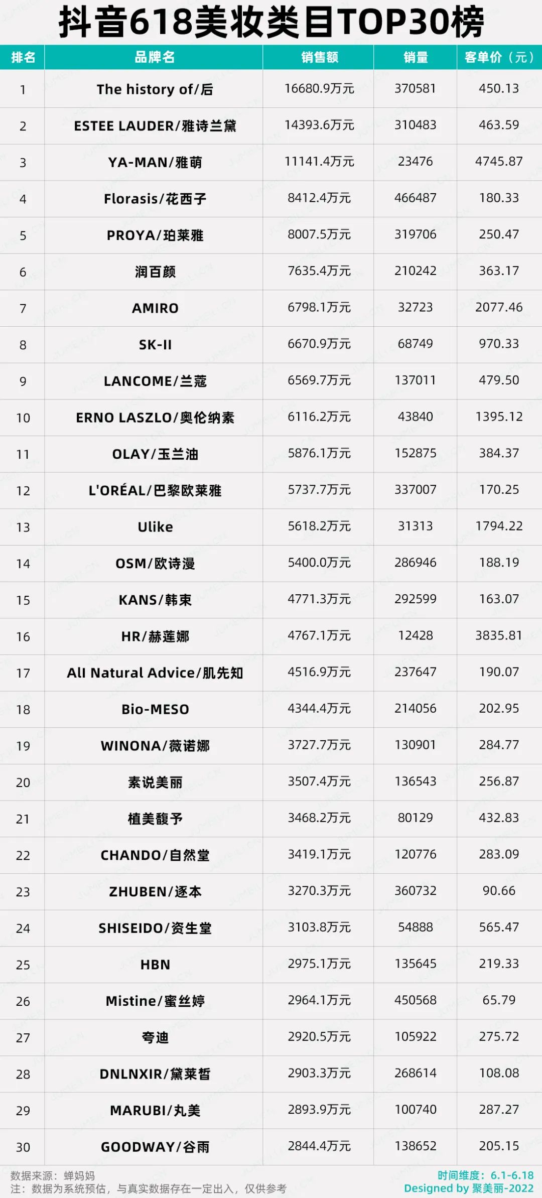 与去年TOP30榜中大部分品牌体量都在1000w-3000w之间的成绩相比,今年抖音618有了明显增幅。除了特别头部的品牌外,上榜的品牌大部分的体量能达到3000w-5000w。其中whoo后、雅诗兰黛、雅萌3个品牌成交额破亿,而去年618仅whoo后一个品牌销售额破亿。(2021年抖音618数据详情)