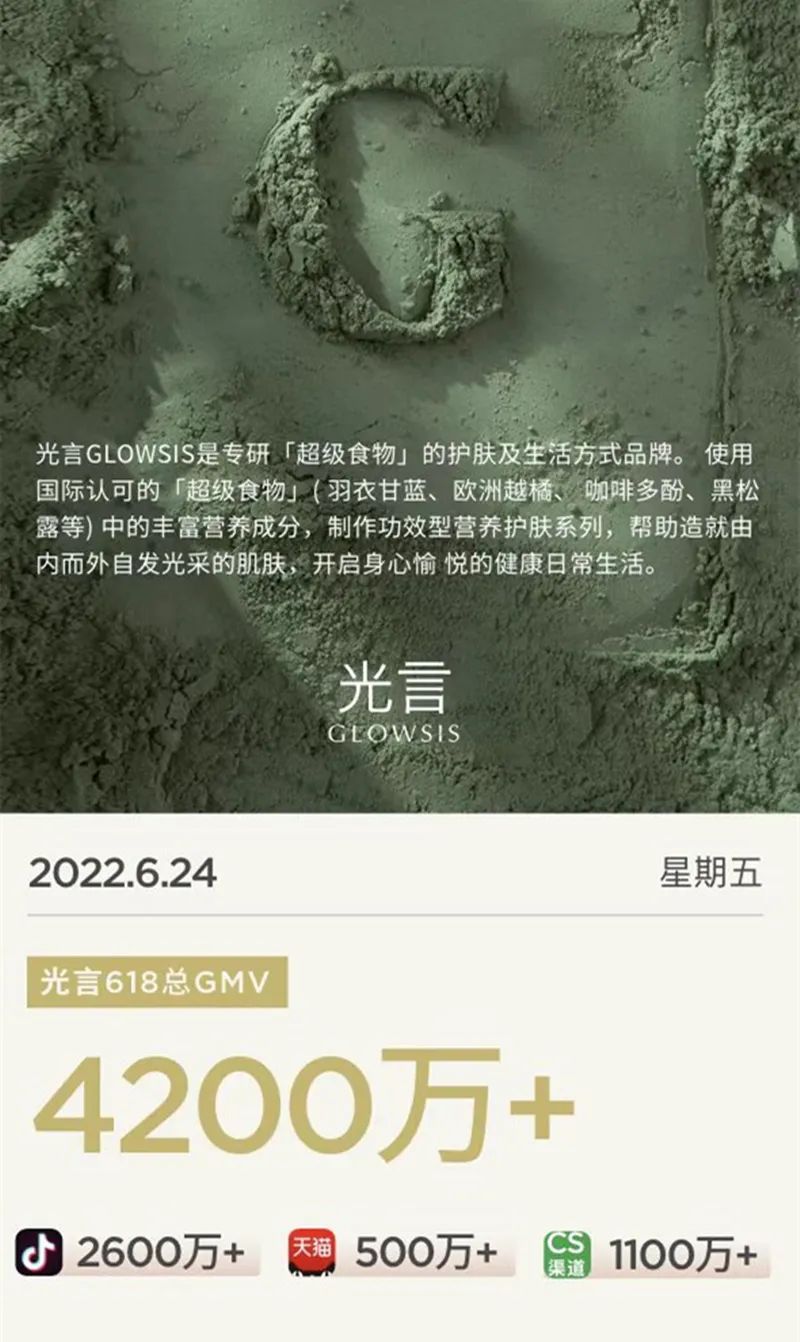 新锐品牌光言GLOWSIS的创始人XIAOXIAO也向记者透露,光言今年618全渠道超4200w,其中抖音的销售额差不多是天猫的5倍。