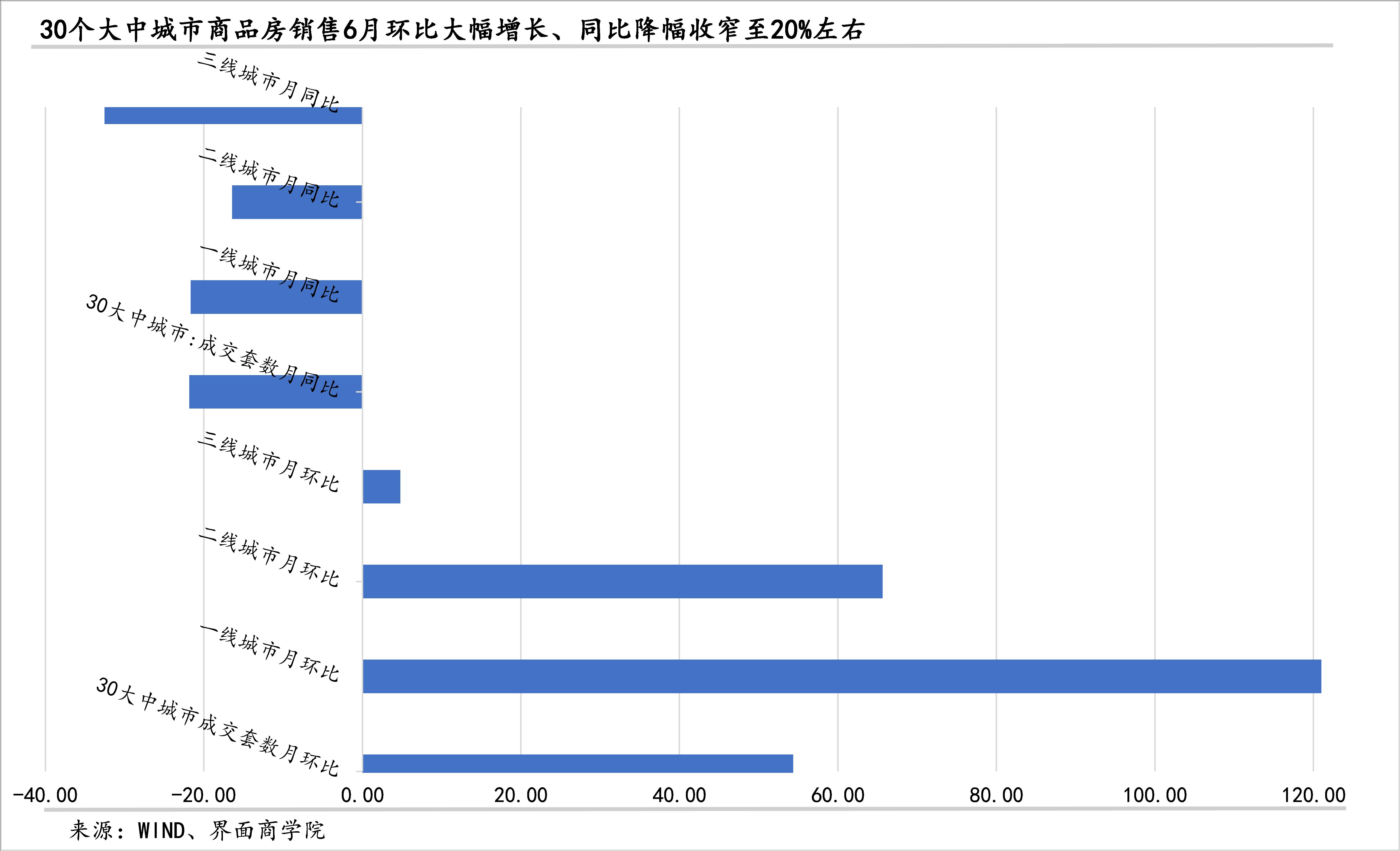 从同比来看,商品房销售同比降幅显著收窄,但仍然是负增长。30个大中城市6月日均成交套数、成交面积同比降幅收窄了27.8、30.8个百分点,同比下降19.4%、17.5%。其中,二线城市同比表现最佳,降幅收窄逾32个百分点,成交套数、成交面积同比下降14.8%、10.2%;一线城市次之,同比降幅收窄逾30个百分点,同比下降20%左右;三线城市同比降幅收窄逾16个百分点,同比降幅仍然超过27%。
