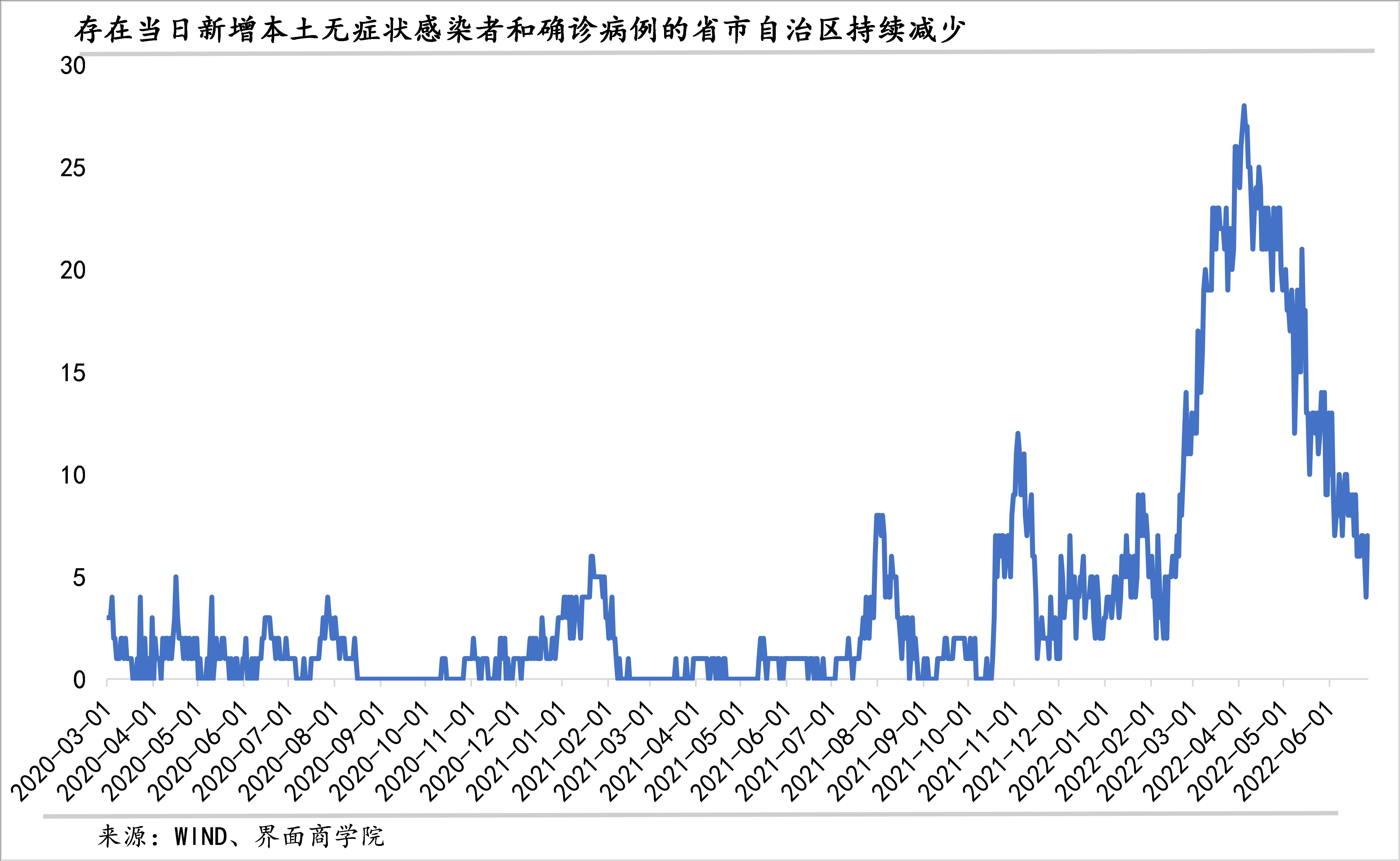 从涉疫的省市自治区数量来看,6月26日,存在本土疫情的省市自治区有7个,较5月末减少了6个,较4月份的高点减少了21个。