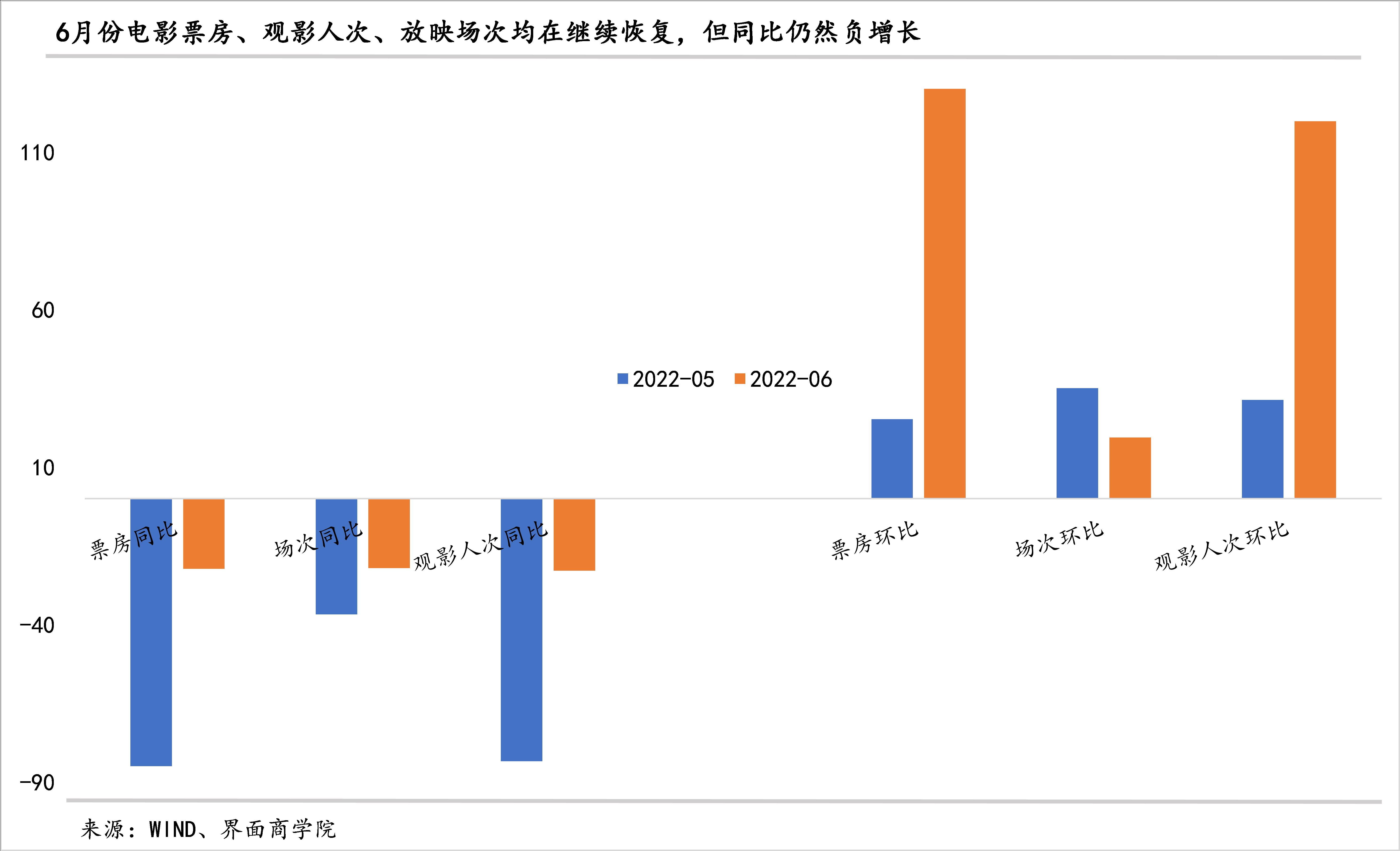 电影院线继续回暖,观影人次和电影票房不止翻了一番,但同比仍然负增长。6月份日均观影人次和日均电影票房环比继续上涨,且涨幅显著扩大至143.7%、158.8%,日均场次环比上涨了21.0%。