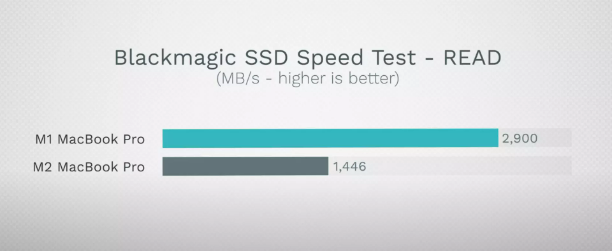 因为沿用了上一代模具而受到消费者批评的13吋 M2 Macbook Pro现在可能更让人失望了。有测评博主发现,与上一代同类机型相比,256GB存储空间的最低配MBP,SSD(固态硬盘)的读取速度缩水了几乎一半。