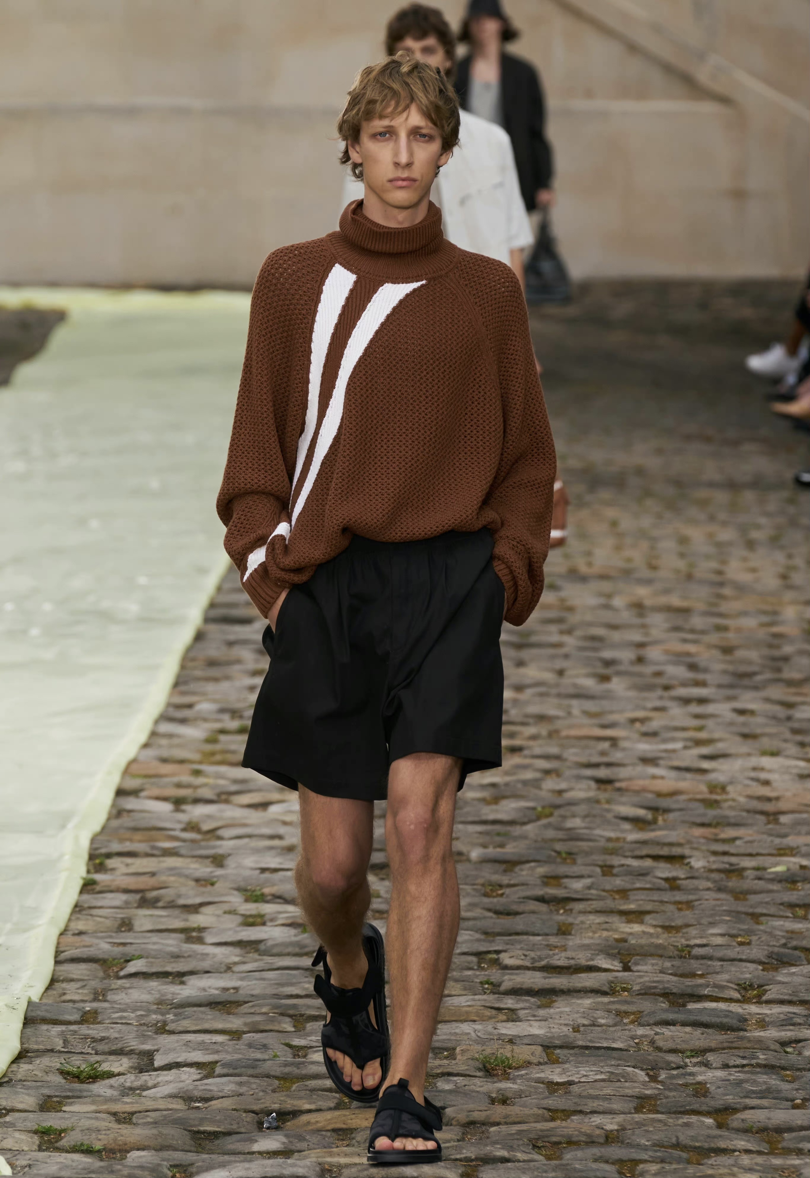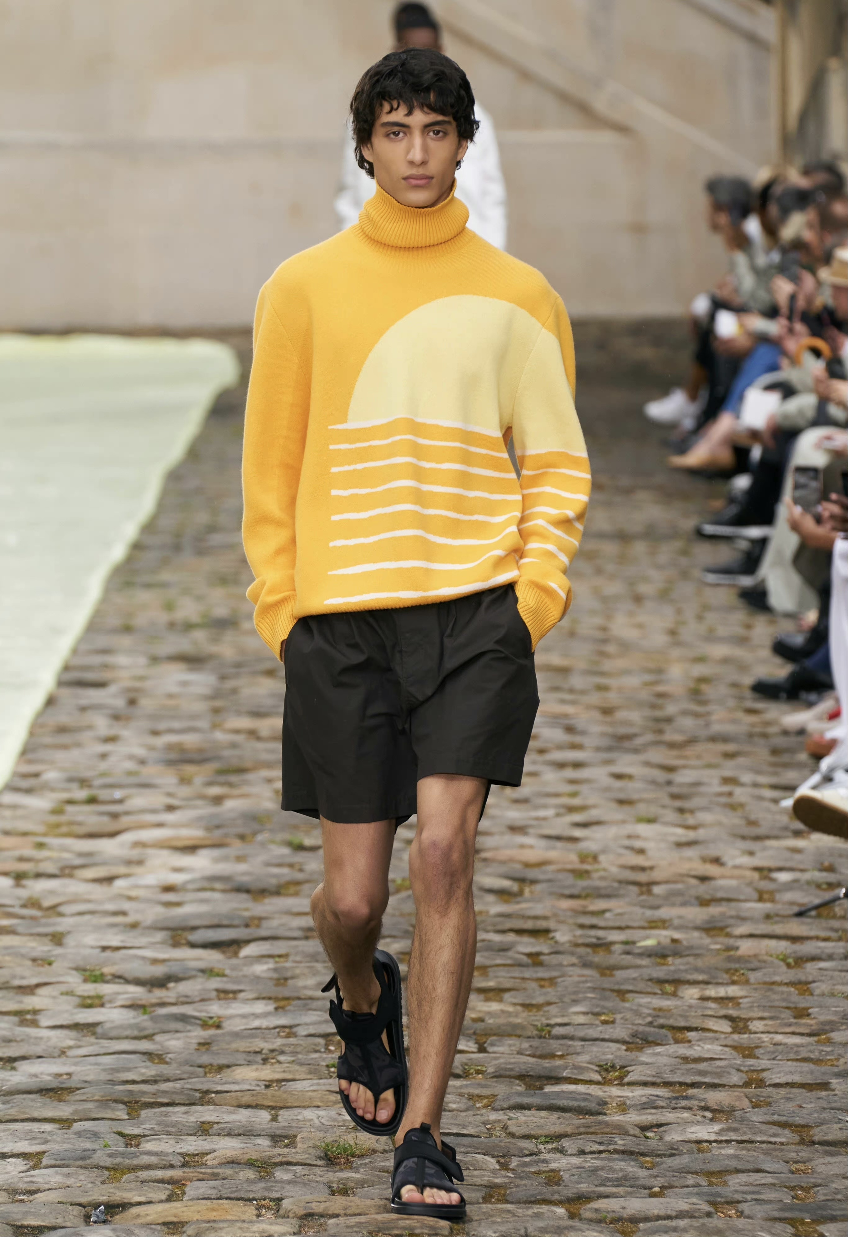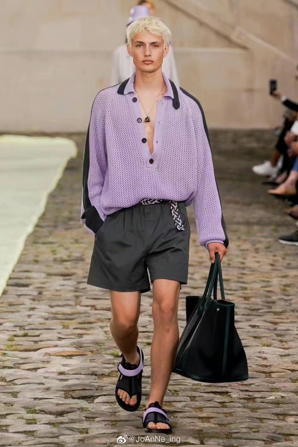 本系列中的很多细节都不负期待地展现着爱马仕简洁清爽的气质,特加入的丁香紫色系列服饰能中和男性服饰过于单一且硬朗的特征,为镂空针织衫、外套等带去一丝恰到好处的柔美风格。一系列清爽的糖果色调也极其适合阳光明媚的夏天——服装颜色承载着甜美诗意,衣服印花更是大胆呈现可爱的海马、吸睛的龙虾以及树叶,轻松唤起夏日的美好记忆。