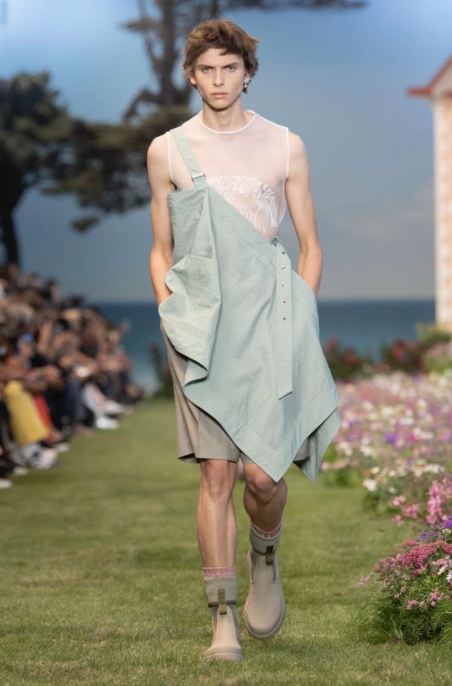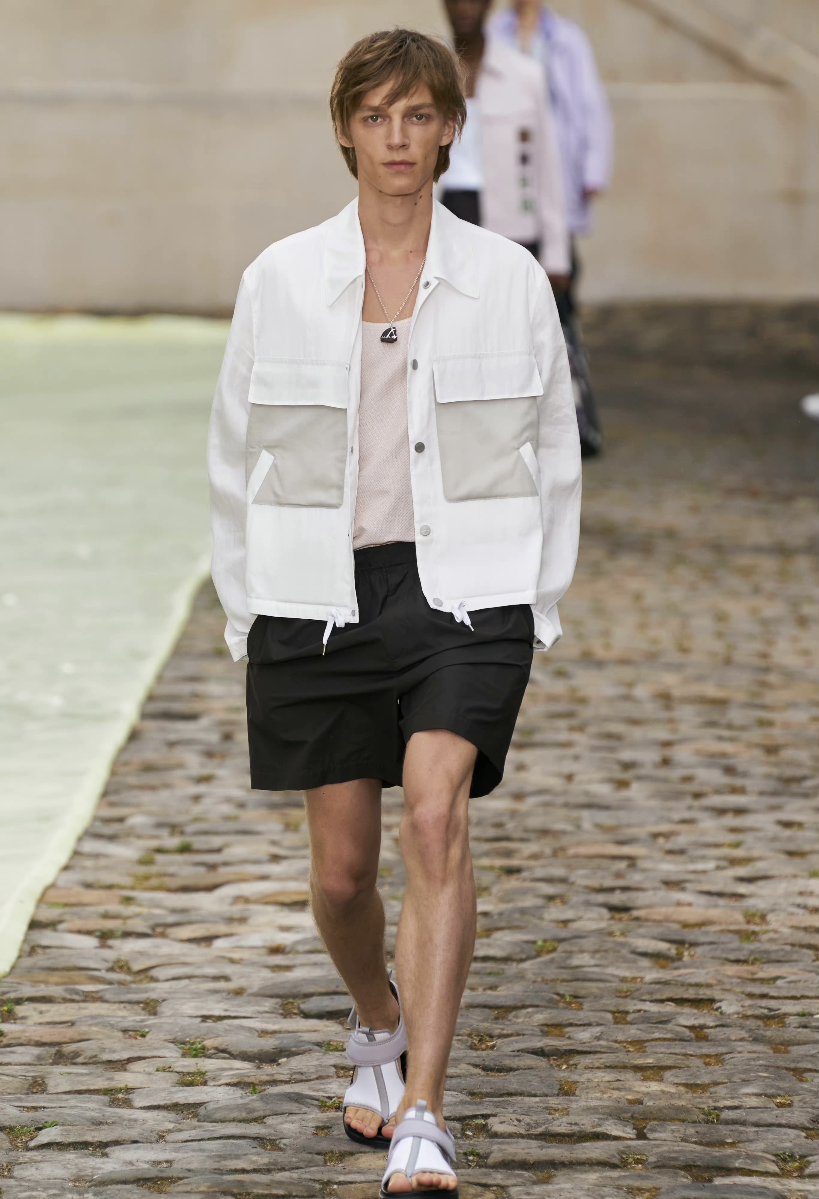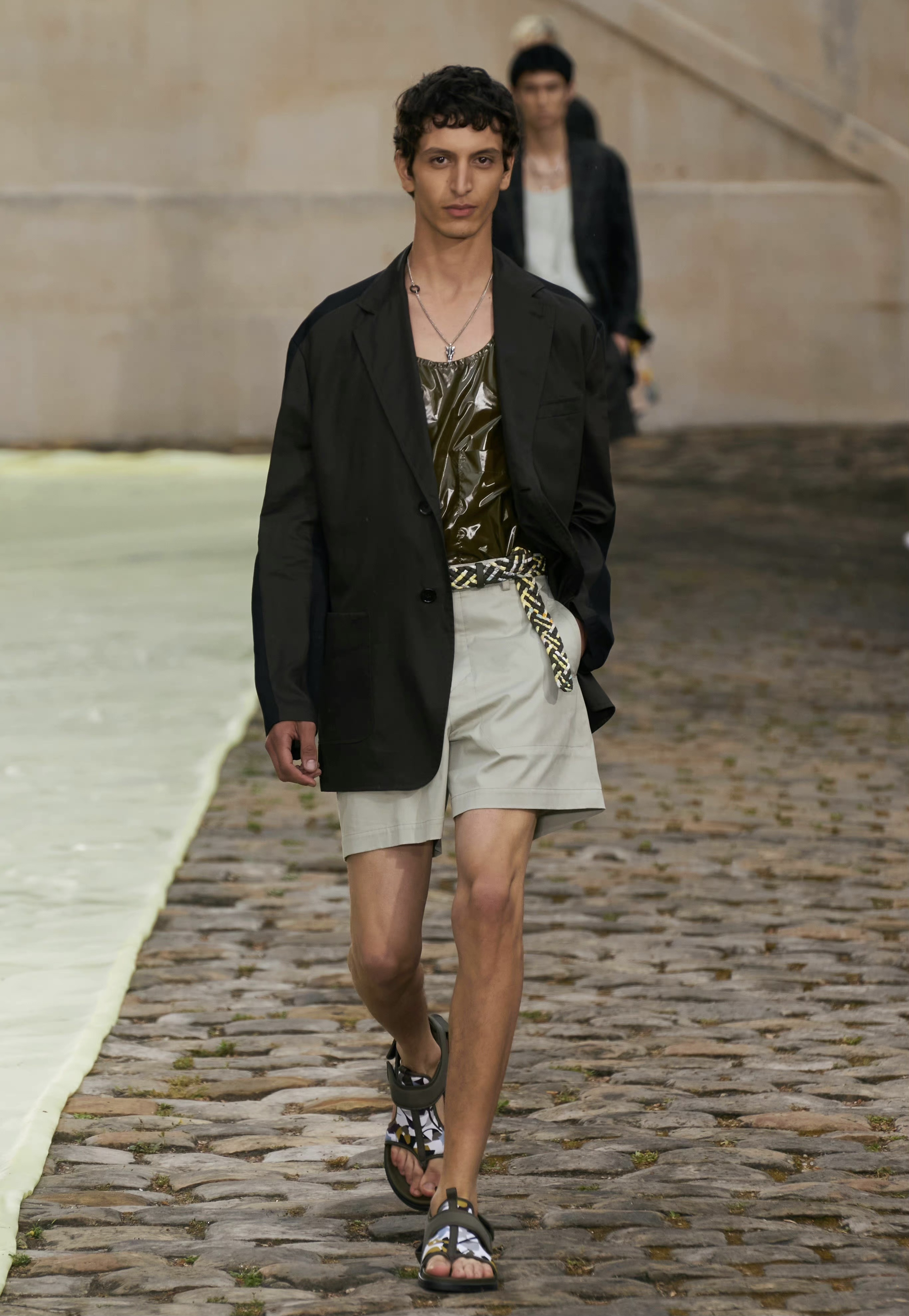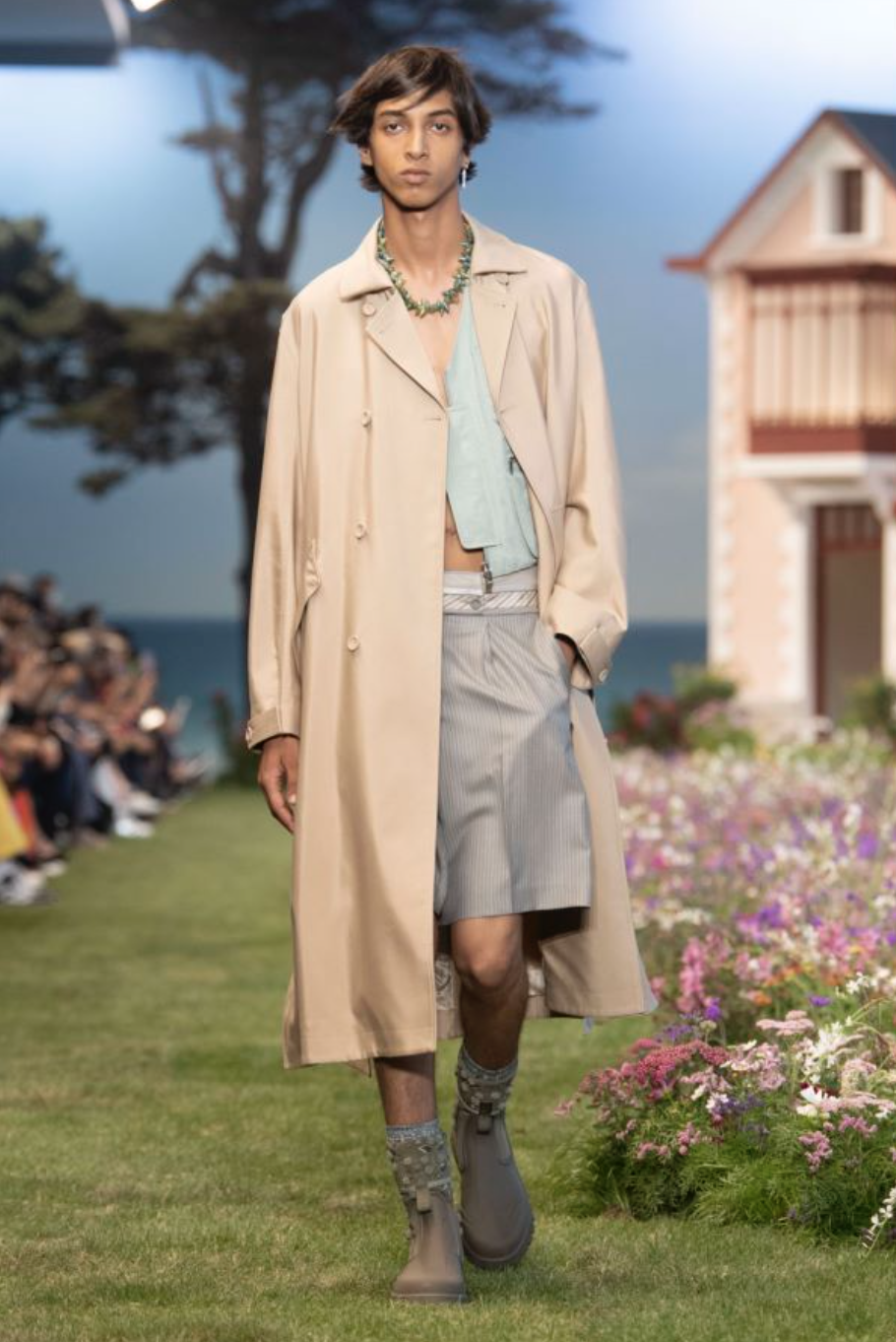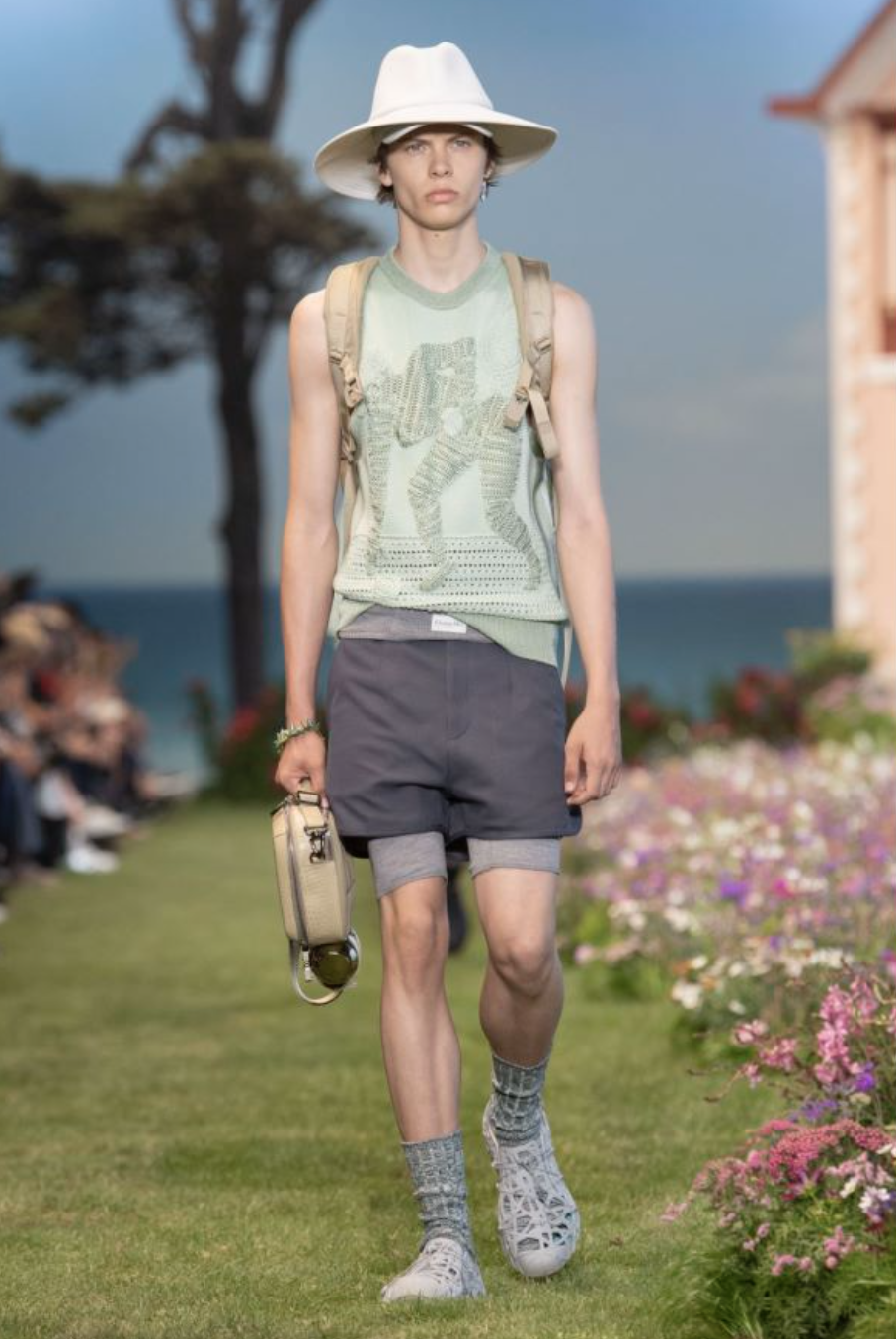 以回收羊线制成的双排扣精裁大衣,搭配借鉴自一九三零年代款式,并饰有束腰的短裤,与休闲鞋履相得益彰,本系列延续经典迪奥套装廓形设计,以半透明欧根纱重塑男士硬朗的正装造型:舒适的棉质外套版型宽松,内搭针织科技面料背心;邓肯格兰特的荷花塘屏风也点缀于反光高科技面料与传统刺绣花边之上;迪奥标志性的藤格纹图案,以绗缝的形式在外套上大放异彩。
