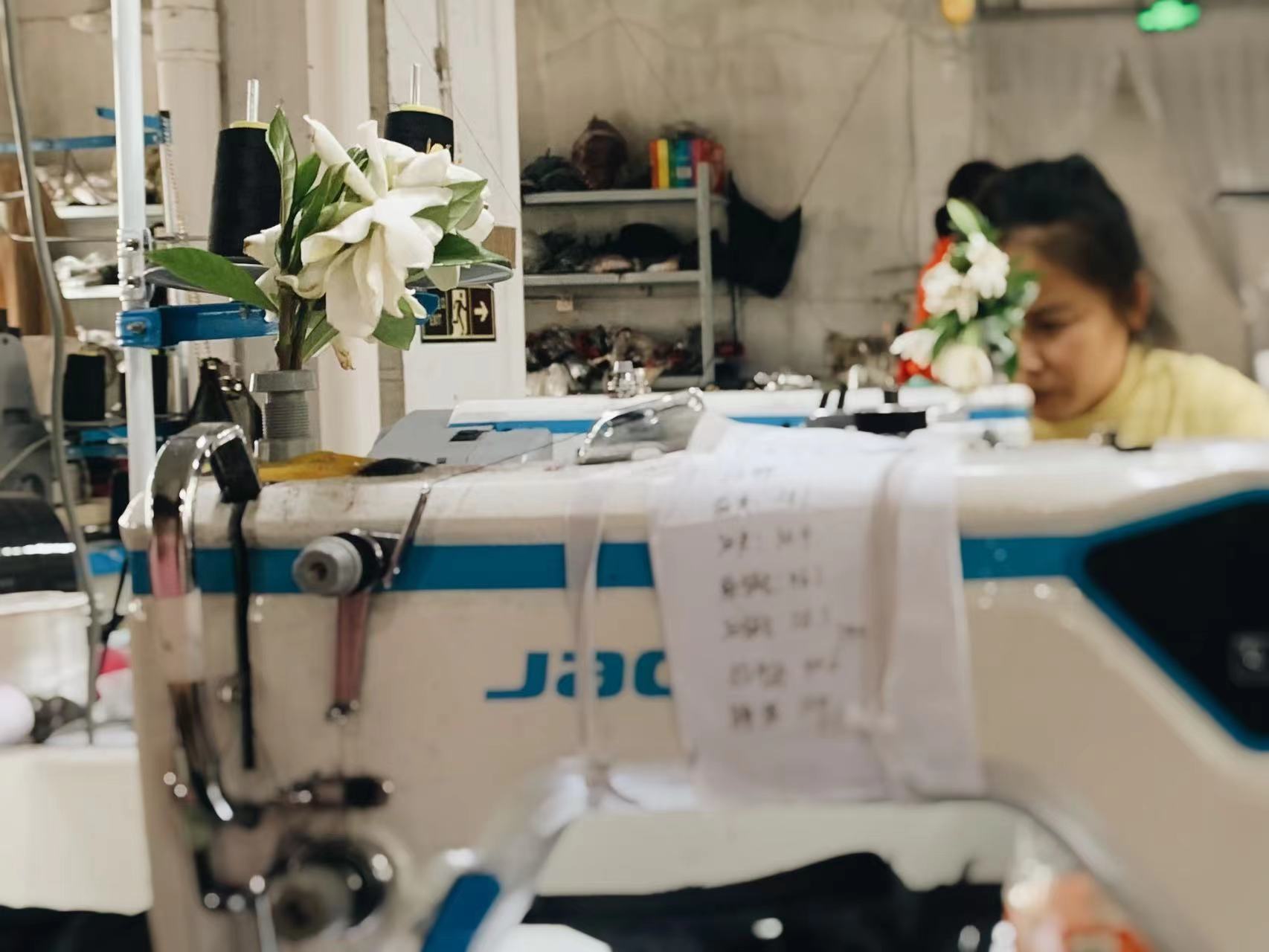 这天下午,她在缝纫机上插了一小束栀子花。“时不时闻到香气,挺好。”她想,是这个味道让人没那么累了,从早上7点到现在,快8个小时,她手上的活儿还没停过。今天的目标是做四、五件黑色亮片长裙,她每个月能赚四、五千块钱。