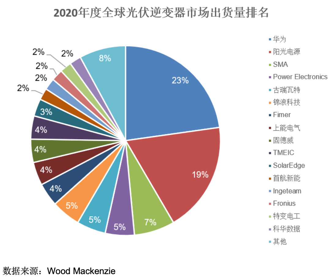 根据国际知名的电力与可再生能源研究机构Wood Mackenzie发布的统计数据,自2015年开始,华为、阳光电源和SMA的光伏逆变器出货量均排名前三,其中华为和阳光电源的市场份额较高,市场地位较为稳定;而中部厂商市场份额在2%-5%左右,市场份额较为接近。