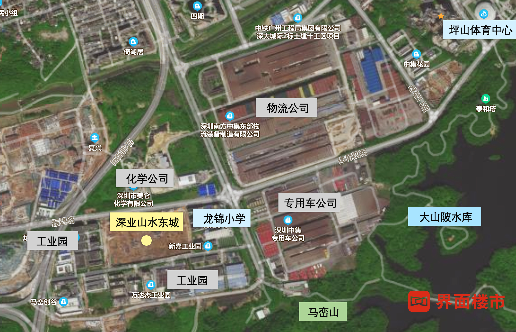 不过,尽管项目是综合大盘,但周边的环境却非常一般。就地图来看,虽然项目周边有大山陂水库、马峦山,这也是项目对外的宣传要点。但综合而言,周边多为工业区、物流公司、化学公司等,缺乏其他商品房小区相伴,也缺乏成熟的居住氛围。