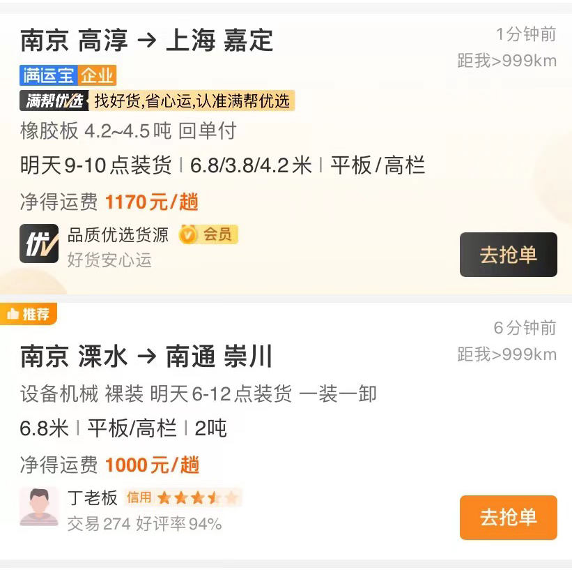 现在,随着运力逐渐恢复正常,进出上海的货运价格也大幅回落。界面新闻记者在货运平台看到,同样是6.8米的货车运输订单,6月27日从南京和东台到上海的运费基本在2000元以内,最低价仅为1000元,与4月高位点相比下降幅度超过九成,接近正常水平。