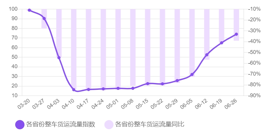 从全国来看,货运量仍没有完全恢复,上周全国的整车货运流量在去年同期的8成左右。