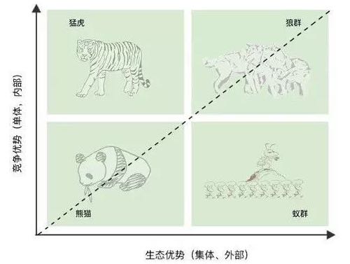 我们以“竞争优势”和“生态优势”为两个维度,可以勾画出不同企业的优势图谱(见下图)。根据企业在图谱中的不同位置,可以区分为“熊猫”、“猛虎”、“蚁群”、“狼群”这四种类型。