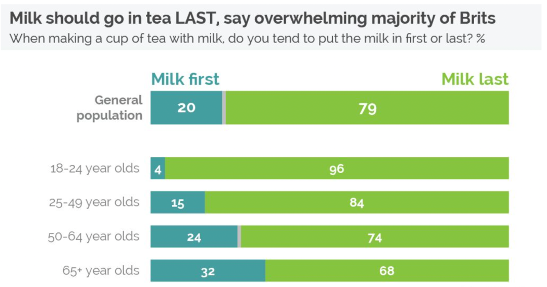 甚至关于在喝茶时先加糖还是先加奶的细节,严肃的英国人都要讨论一番。市场研究公司yougov发起的一项调查中显示,绝大多数的英国人觉得应该先加茶再加奶。