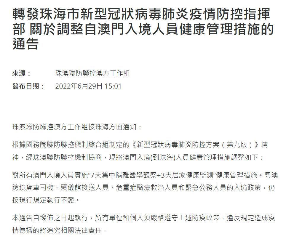 根据国务院联防联控机制综合组制定的《新型冠状病毒肺炎防控方案(第九版)》精神,经珠澳联防联控机制协商,现将澳门入境(到珠海)人员健康管理措施调整如下: