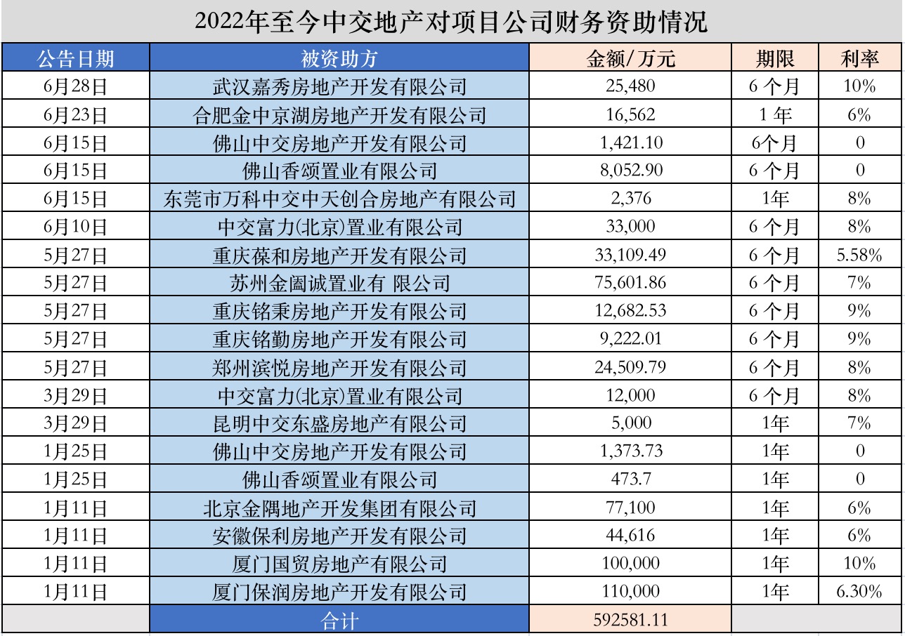 界面新闻据公告统计,今年以来,中交地产对关联项目公司进行了19次财务资助(包含续借),资助额合计达到59.26亿元。资料显示,被资助方公司基本都正在对地块进行开发建设,多为2020年、2021年取得的地块。