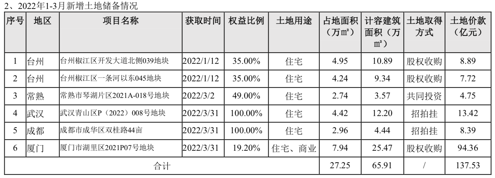 业绩上,一季度报显示,中交地产实现营收39.48亿元,归属母公司股东净利润-4154.41万元,比去年同期分别增长92.34%、70.66%,全口径签约销售金额130.45亿元,同比增长38.69%,权益口径签约销售金额106.03亿元,同比增长101.46%。一季度,中交地产还新取得了6块土地。