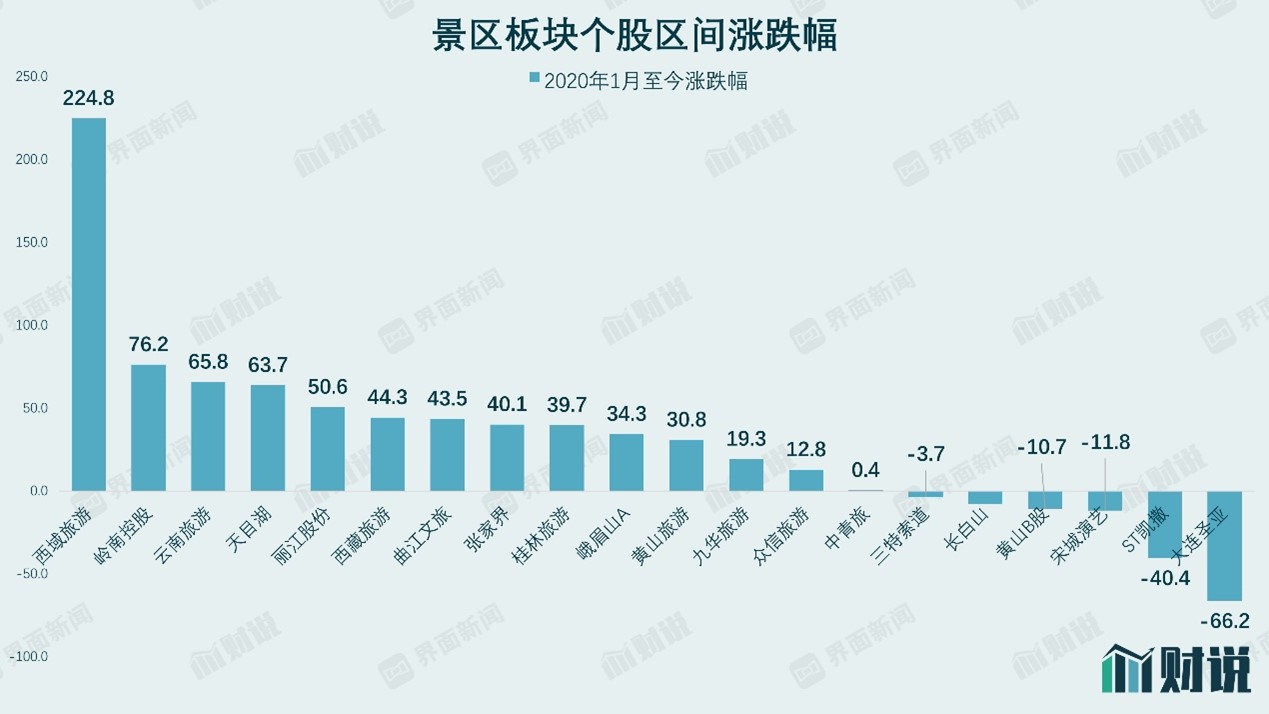 景区板块中多数个股也已超过2020年初的股价。只有三特索道(002159.SZ)、长白山(603099.SH)、宋城演艺(300144.SZ)、ST凯撒(000796.SZ)和大连圣亚(600593.SH)的股价还没有恢复至2020年初的水平。