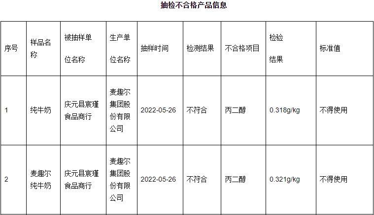 近日,浙江省庆元县市场监管局公示2022年第4期食品抽检检验情况。五条不合格信息中,两条来自上市公司麦趣尔集团股份有限公司(002719.SZ),均为麦趣尔纯牛奶,不合格项目为丙二醇,标准值为“不得使用”。