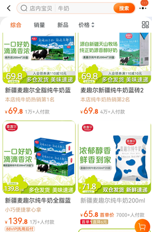 天猫麦趣尔旗舰店中,本店纯牛奶热销第1名的产品月销1万+,评价3万+。