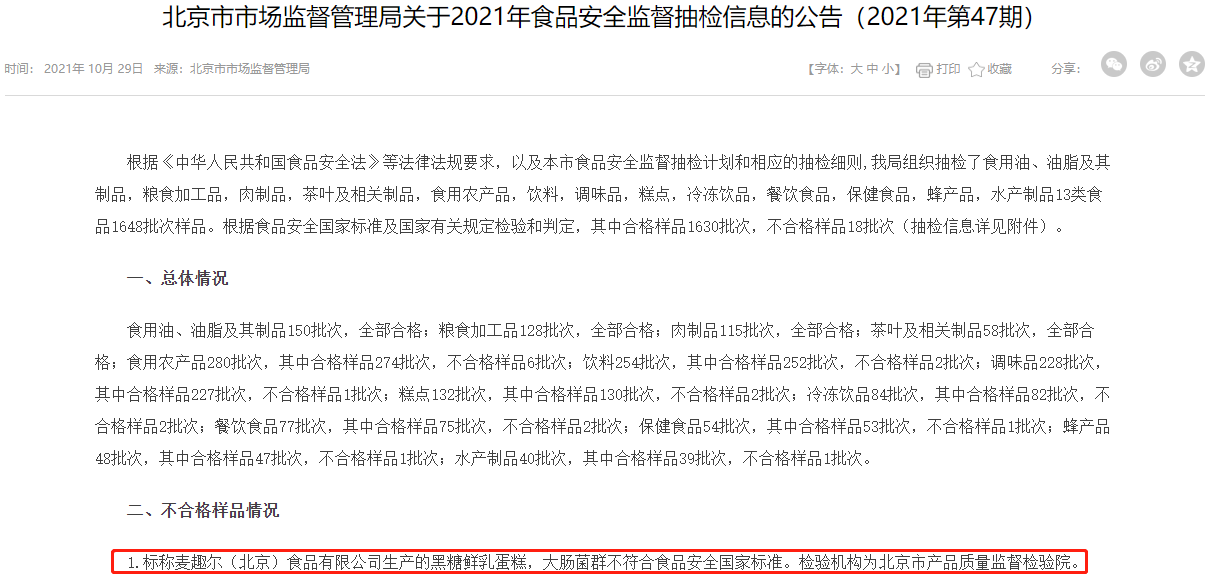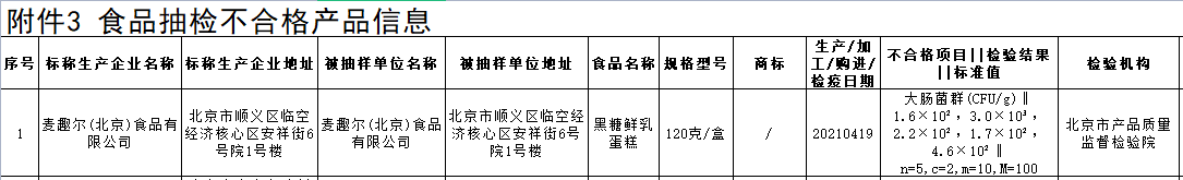2021年10月29日,北京市市场监督管理局发布关于2021年食品安全监督抽检信息的公告(2021年第47期)。其中,标称麦趣尔(北京)食品有限公司生产的黑糖鲜乳蛋糕(120克/盒、20210419),大肠菌群不符合食品安全国家标准,检验结果为1.6×10²,3.0×10³,2.2×10²,1.7×10²,4.6×10²CFU/g标准值为n=5,c=2,m=10,M=100CFU/g。