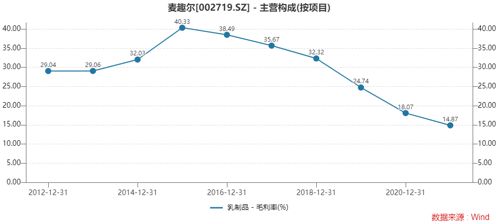 值得注意的是,麦趣尔乳制品毛利率近年降幅较大,2015年公司乳制品毛利率高达40.33%,一路下滑至2021年的14.87%。六年时间毛利率下降了多达25.46个百分点,也影响了麦趣尔的利润表现。