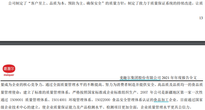 质量作为核心竞争力在麦趣尔财报中进行披露。财报称,“公司制定了‘客户至上、品质为本、预防为主、确保安全’的质量方针”,并“严格按照国家标准或企业标准组织生产”。