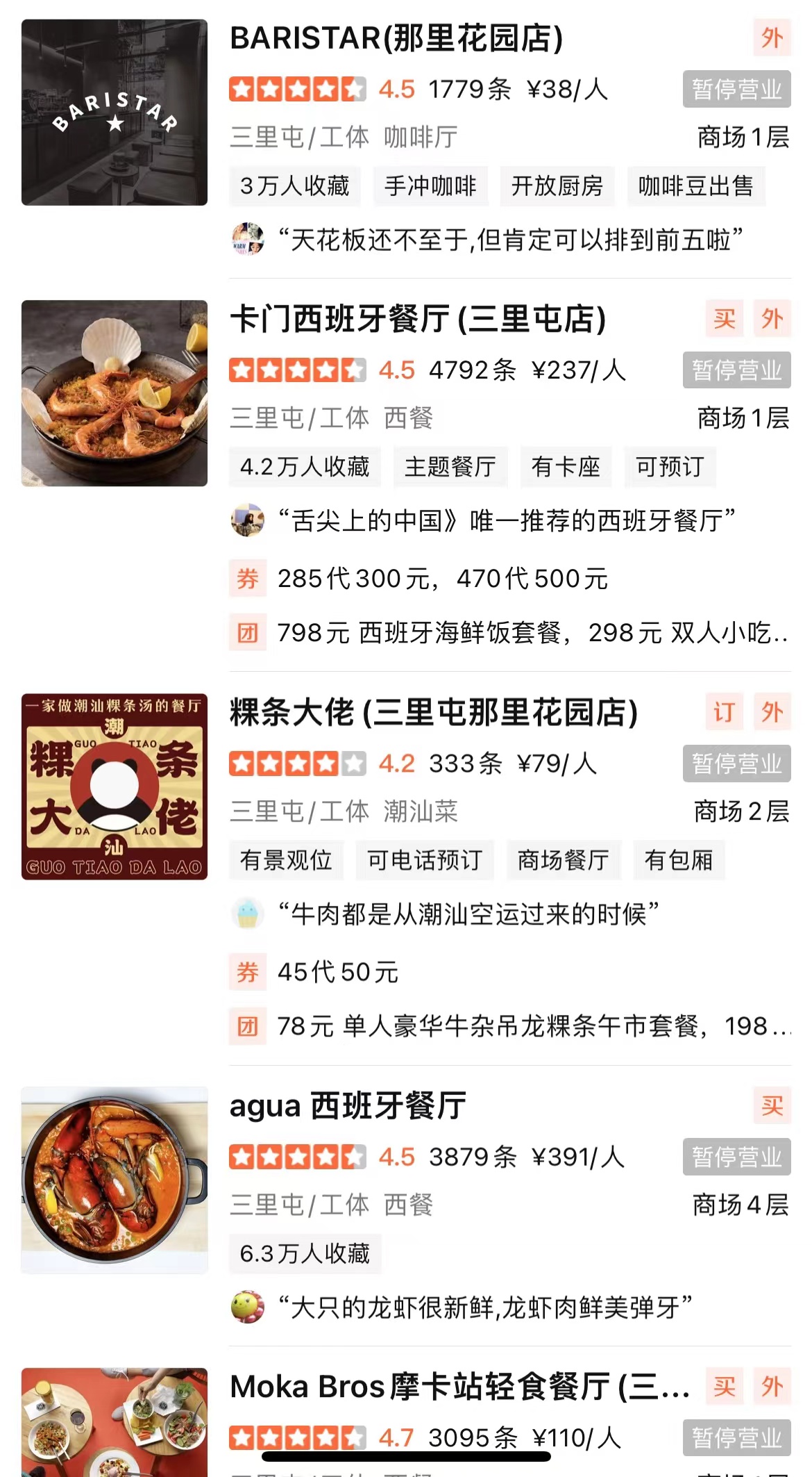 界面新闻6月30日在大众点评平台上看到,这里的一部分商户已经显示暂停营业,比如北京知名的独立精品咖啡馆BARISTAR、卡门西班牙餐厅、agua西班牙餐厅、潮汕餐厅粿条大佬等等。