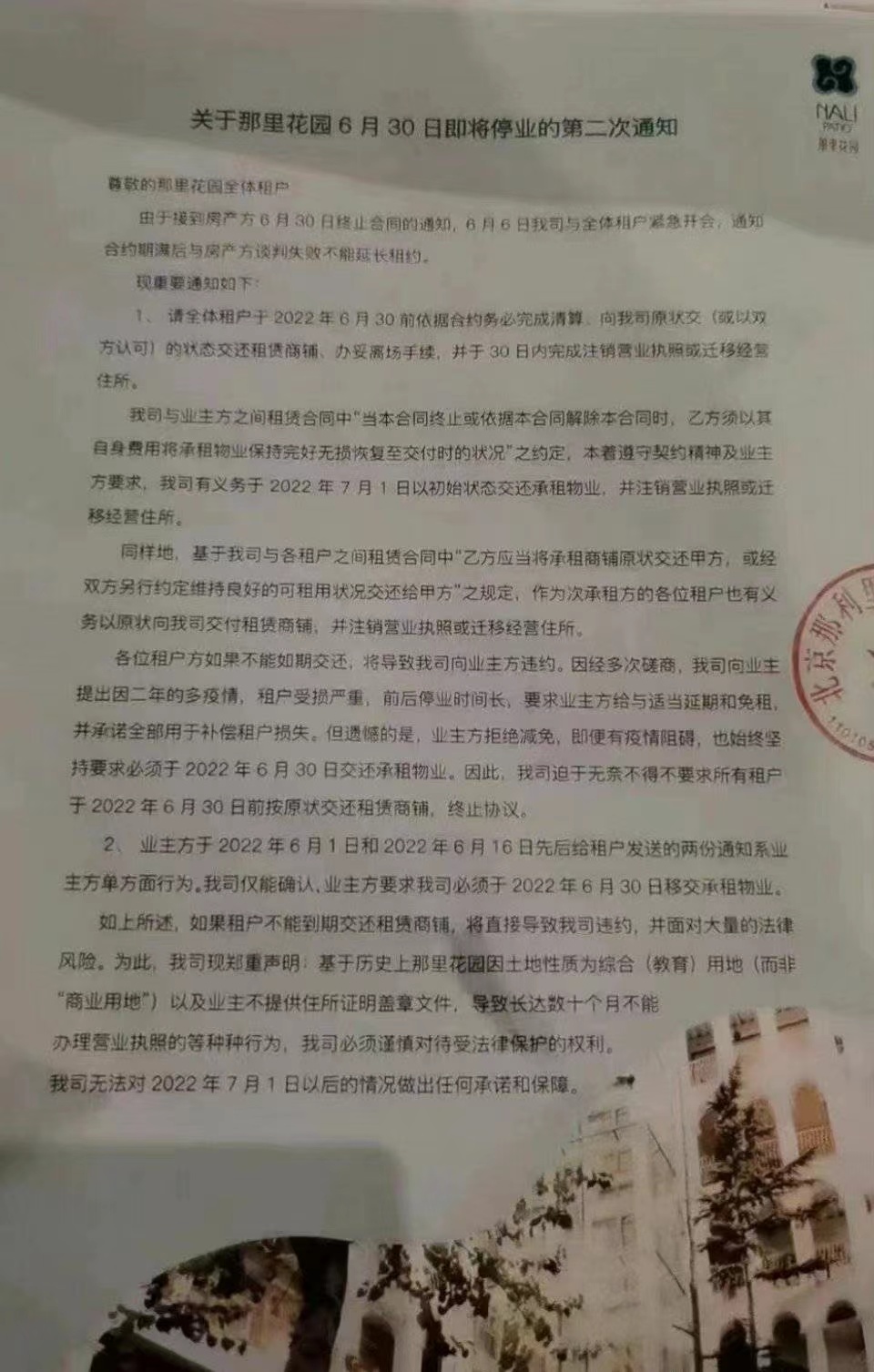 那里花园的改造或与合约纠纷有关。在界面新闻获取的一份“停业通知”里,那里花园的运营方北京那利里商贸有限公司对全体租户表示,他们要在2022年6月30日前依据合约务必完成清算、向该公司原状交(或以双方认可)的状态交换租赁商铺,办妥离场手续,并于30日内完成注销营业执照或迁移经营住所。