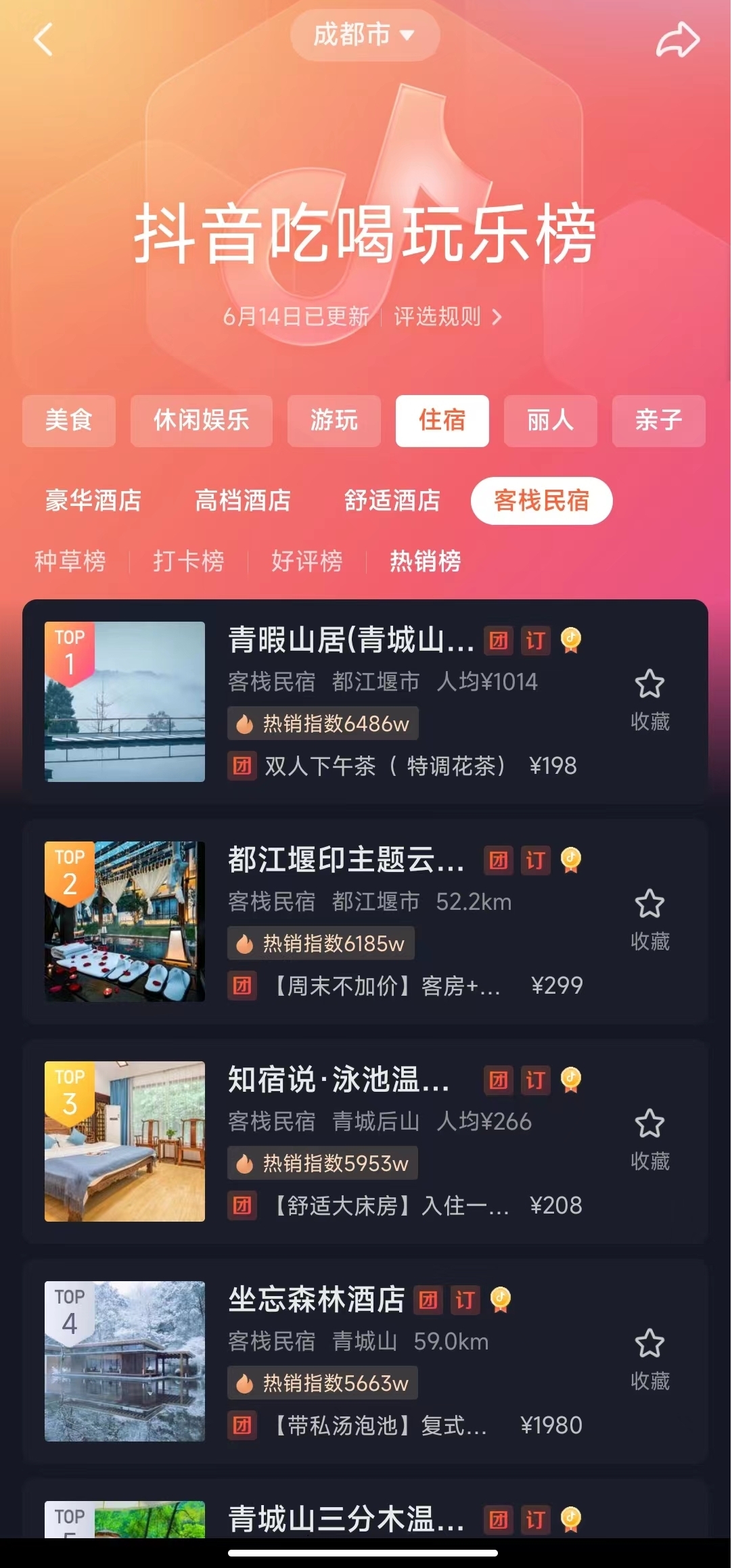 抖音吃喝玩乐榜成都住宿榜显示,青城山青暇山居虽每晚房价近800元起,但其热销指数近6500W,高居热销榜头名。
